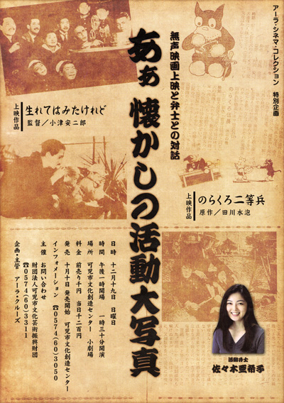 二年目になる可児市文化創造センターでの公演。市民文化グループのalaクルーズ シネ・コレ実行委員会の皆さん、可児市文化芸術振興財団の方々にはたいへんお世話になっております。「生れてはみたけれど」と「のらくろ」の二本立てで、今回もトークあり。温かいお客様の笑い声に包まれて、ほのぼのと公演させていただきました。現在名古屋局勤務のNHK時代の元上司にもお世話になりました。次回は初の試み!子どもたちも巻き込んだ企画を。成功させましょう